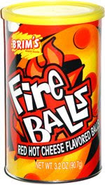 They are bright red and take on the appearance of those old Cheetos asteroids, the hot flavored ones. They don't smell very hot. On the outside of the box is a passage from Isaiah, which we liked considering it's a product that calls itself fiery cheese-flavored balls.